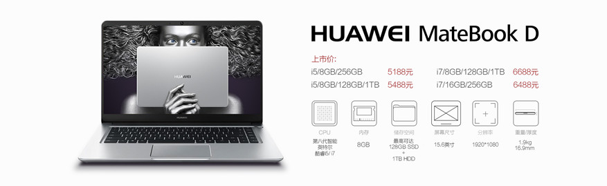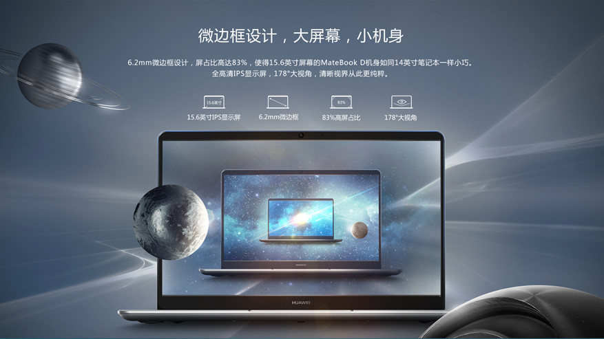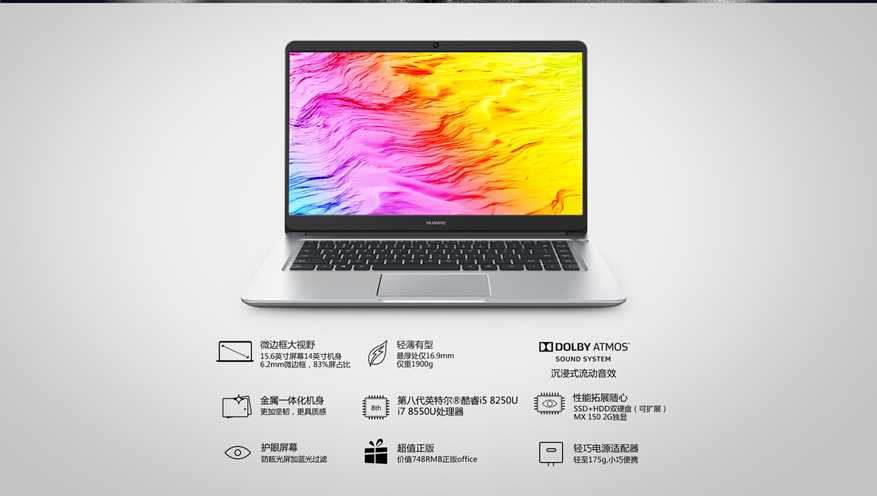 > 華為MateBook D(2018版)15.6英寸輕薄筆記本 金屬一體化機身 杜比全景聲音響 皓月銀+I5/8GB/256GB